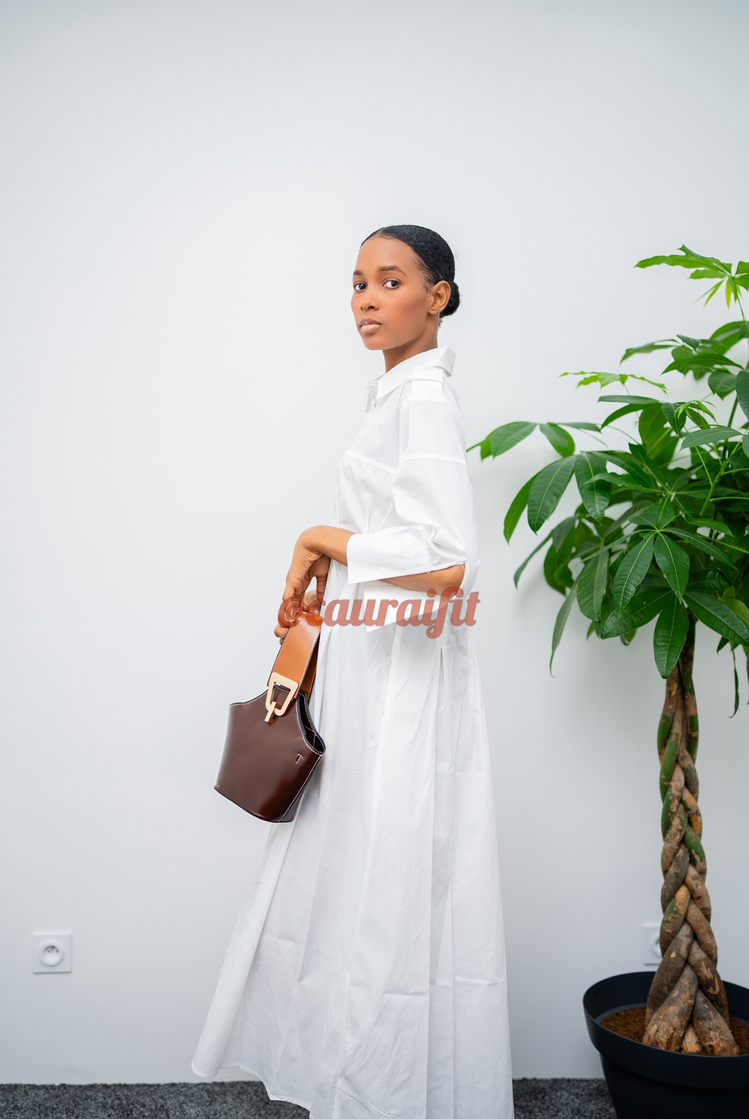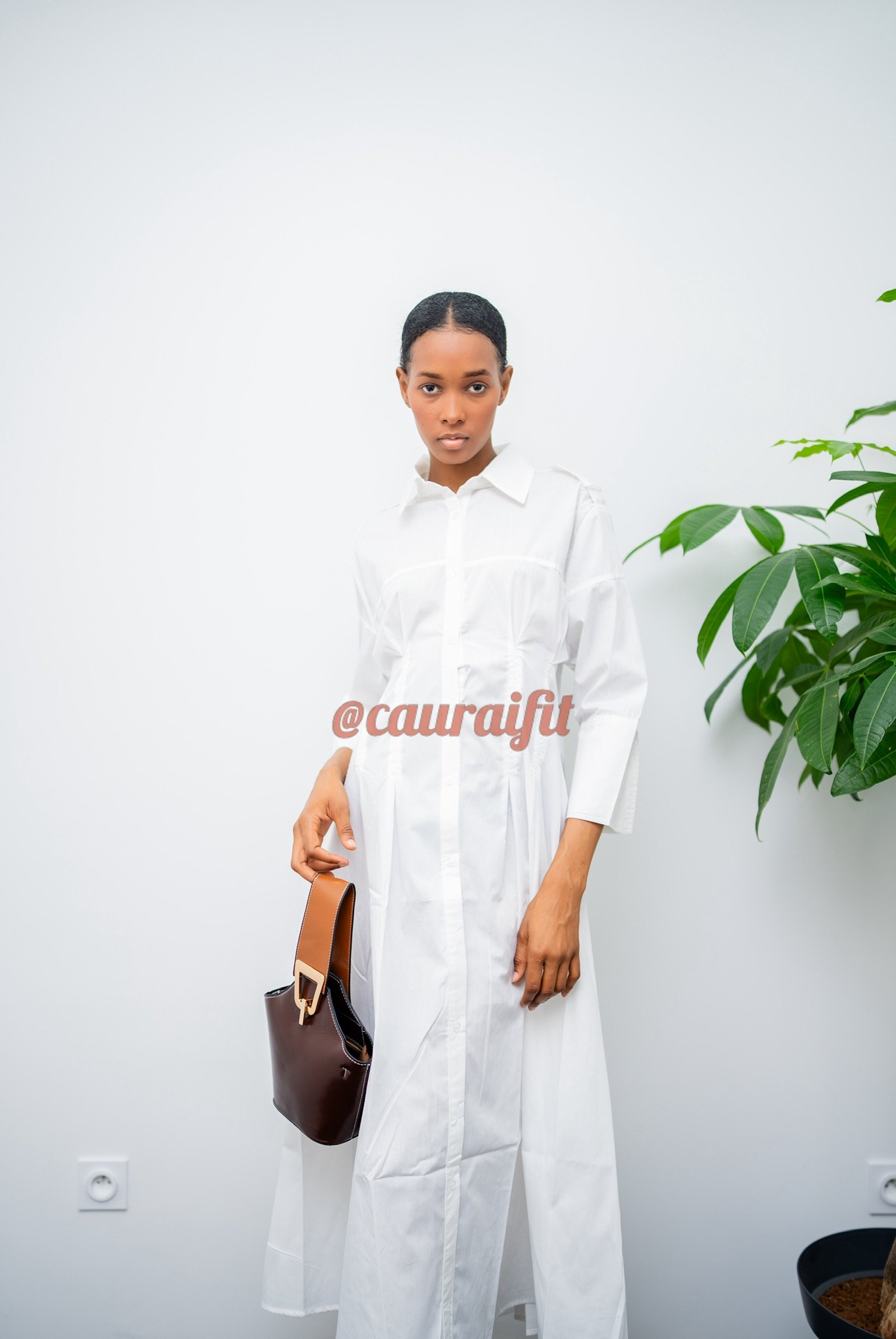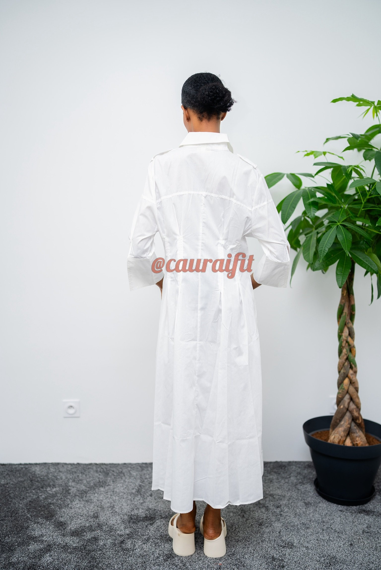 Robe chemise blanche éclatante, en tissu léger et fluide. Sa coupe évasée, Boutonnée à l’avant et les Manches 3/4, la rend agréable à porter toute la journée, tandis que ses fentes latérales apportent une touche de féminité et de modernité. Porte-la avec nos sandales « Alexandra » et le sac « Fatima » : un essentiel du dressing chic et minimaliste.