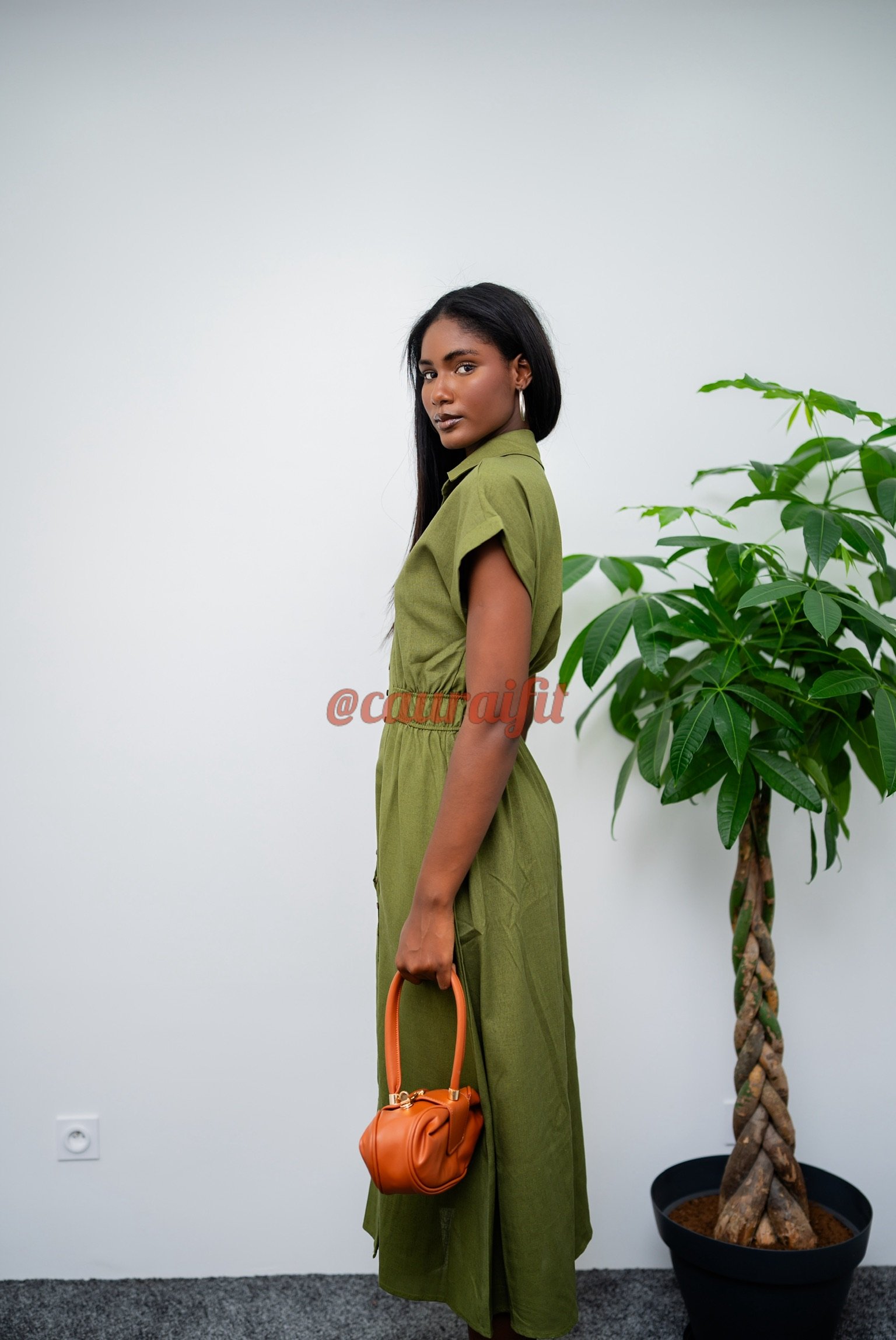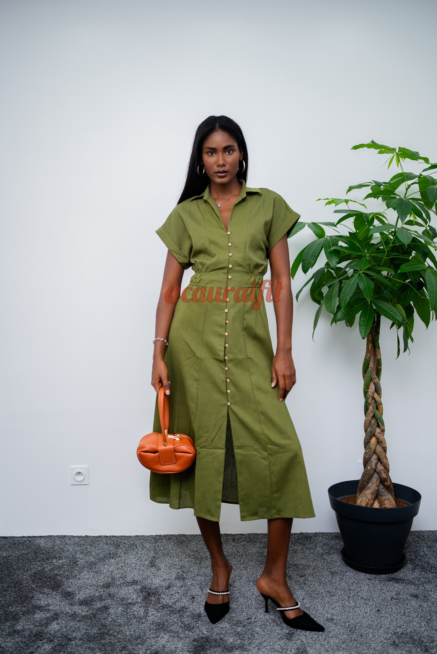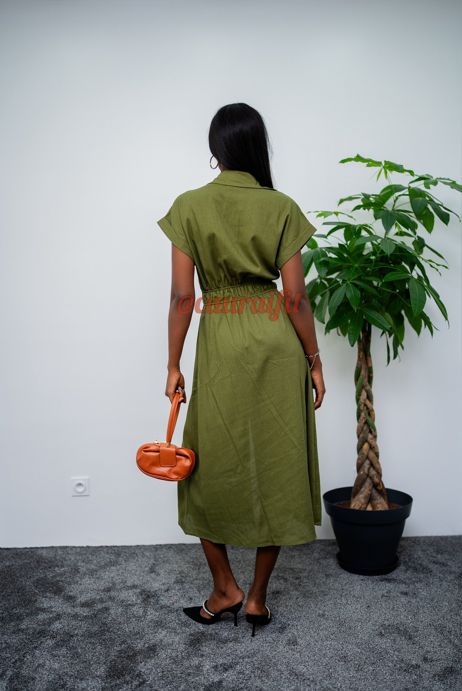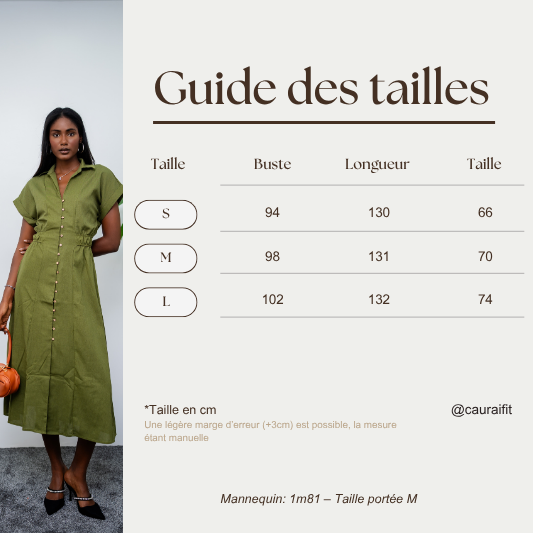 Robe chemise en coton effet lin, dans un vert olive naturel et sophistiqué. Boutonnée sur toute la longueur, fente élégante à l’avant qui dévoile subtilement la jambe et sa coupe ajustée à la taille avec un style structuré et modulable, parfait pour la mi-saison ou les journées estivales. Porte-la avec le sac « Fatou », ou nos mules « Sophia » : elle s’adapte à tous les styles et toutes les occasions.