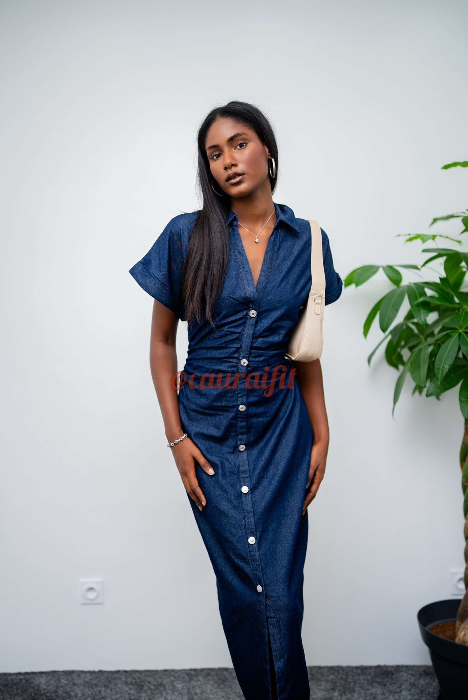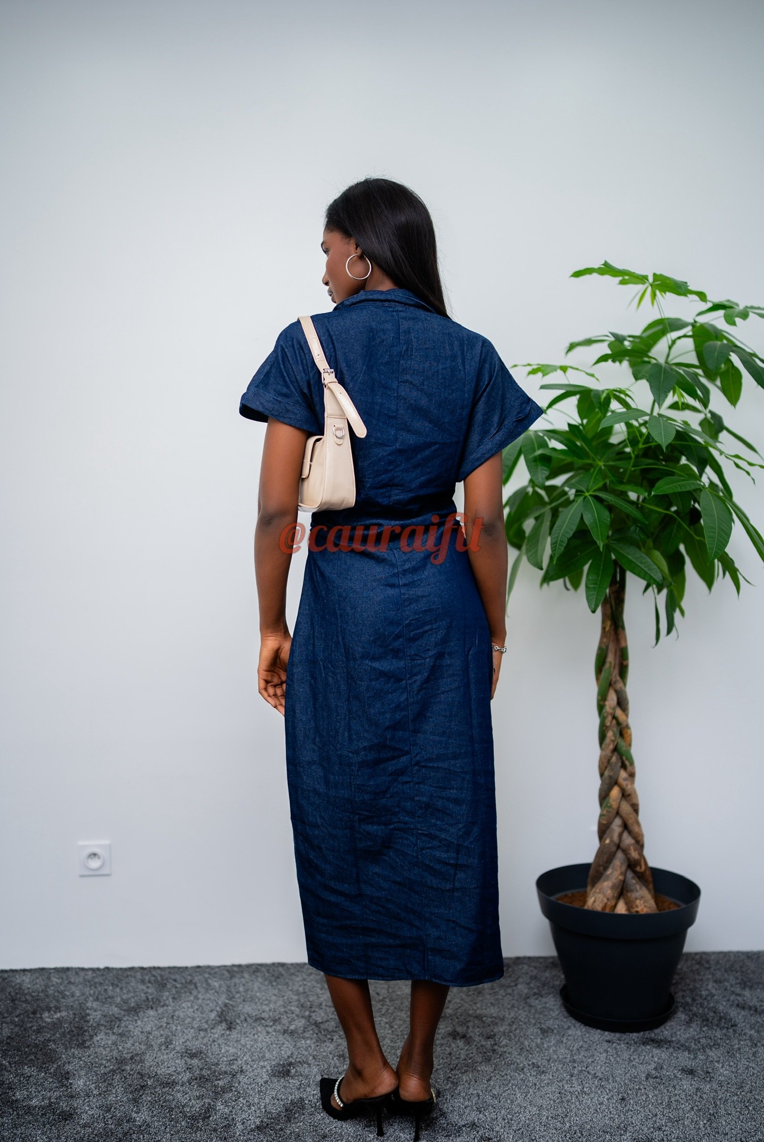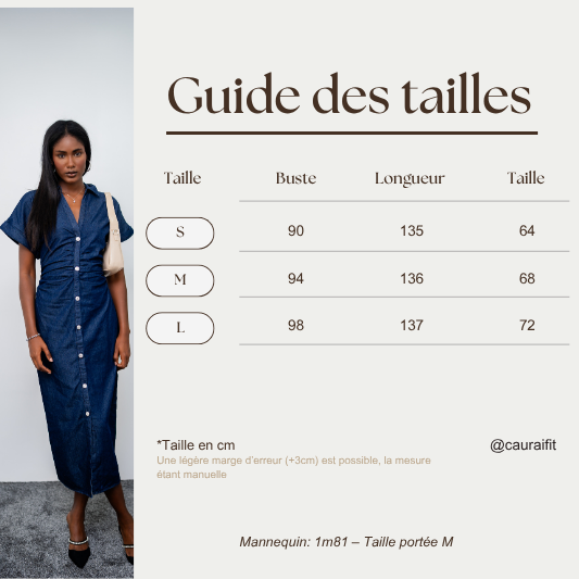 Cette robe en jean à la coupe ajustée sublime la silhouette tout en conservant sa charme brute. Les fronces apportent du volume et de la douceur, contrastant joliment avec la matière. Sa longueur midi et ses manches courtes en font une pièce facile à porter, surtout associée avec nos talons « Sophia » et le sac « Lorrine » de Cauraïfit. Une robe coup de cœur qui conjugue caractère et féminité.
