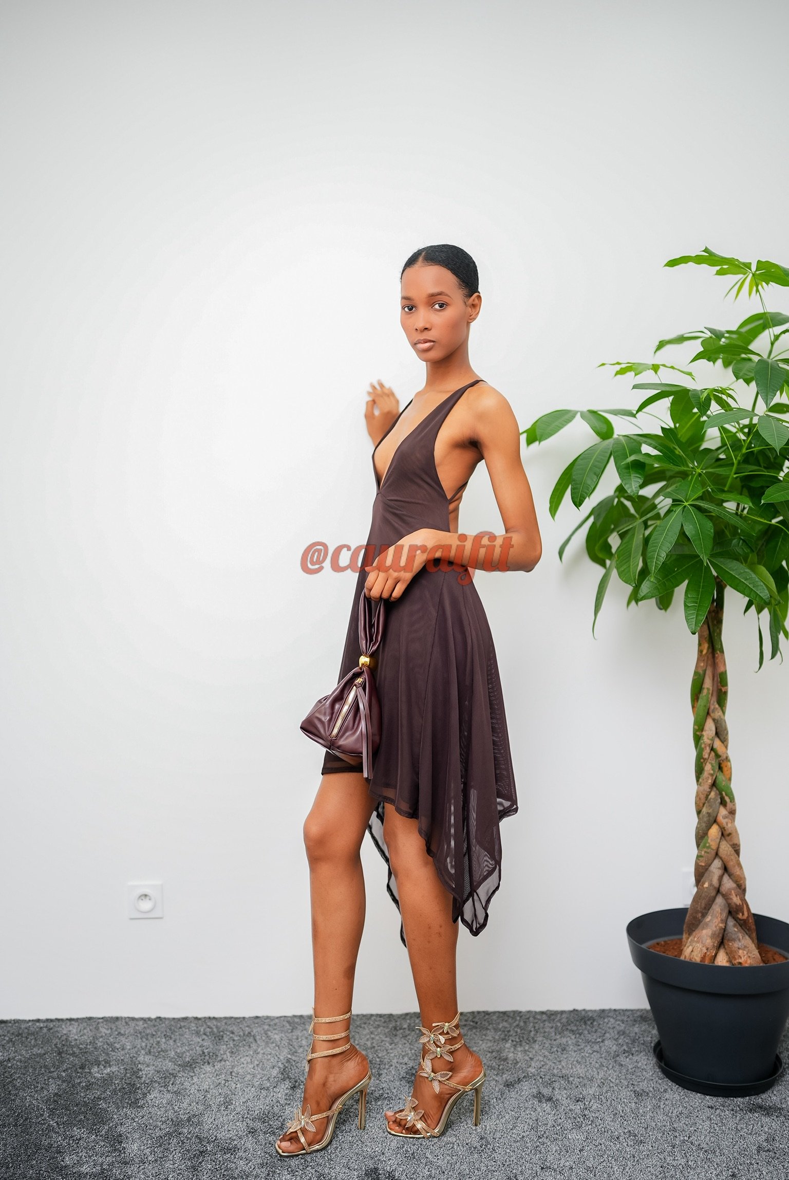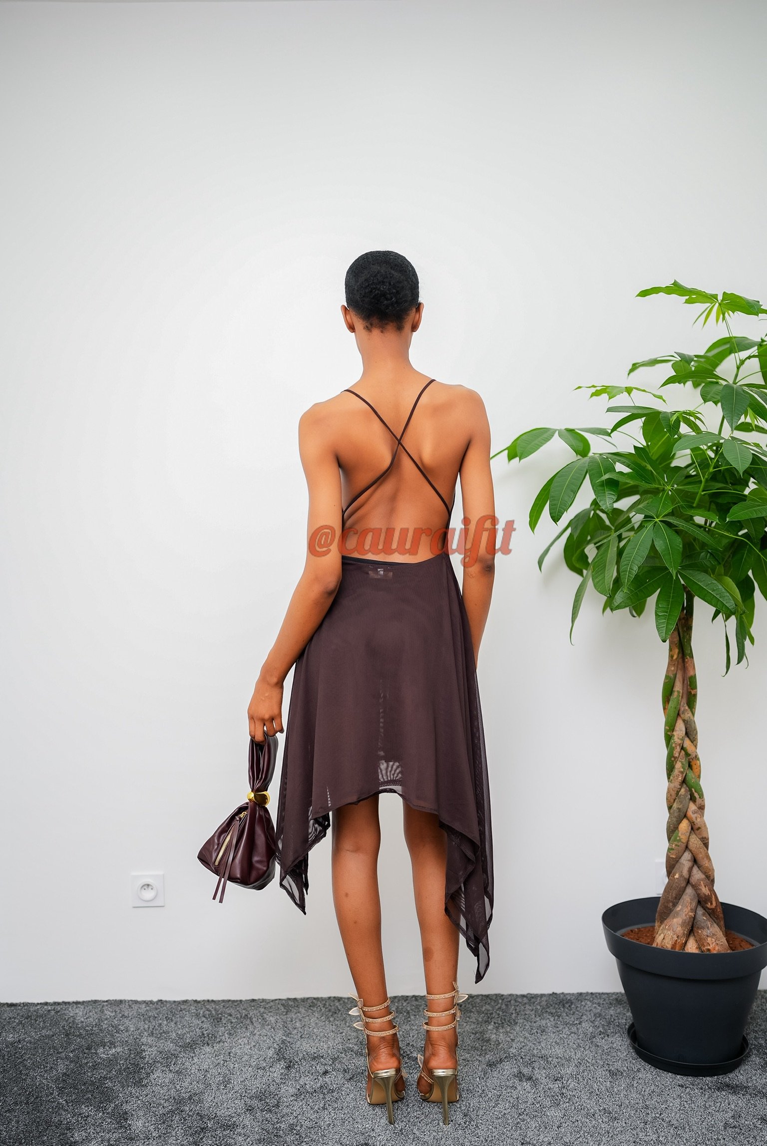 Robe fluide et légère en jersey doux, au design asymétrique moderne et féminin. Son joli décolleté met subtilement en valeur la poitrine, tandis que les fines bretelles se croisent délicatement dans le dos, offrant une vue élégante et structurée. À accompagner avec nos talons « Aïcha », pour une silhouette à la fois naturelle et séduisante. Une pièce idéale pour les beaux jours, les sorties estivales ou les soirées en toute légèreté.