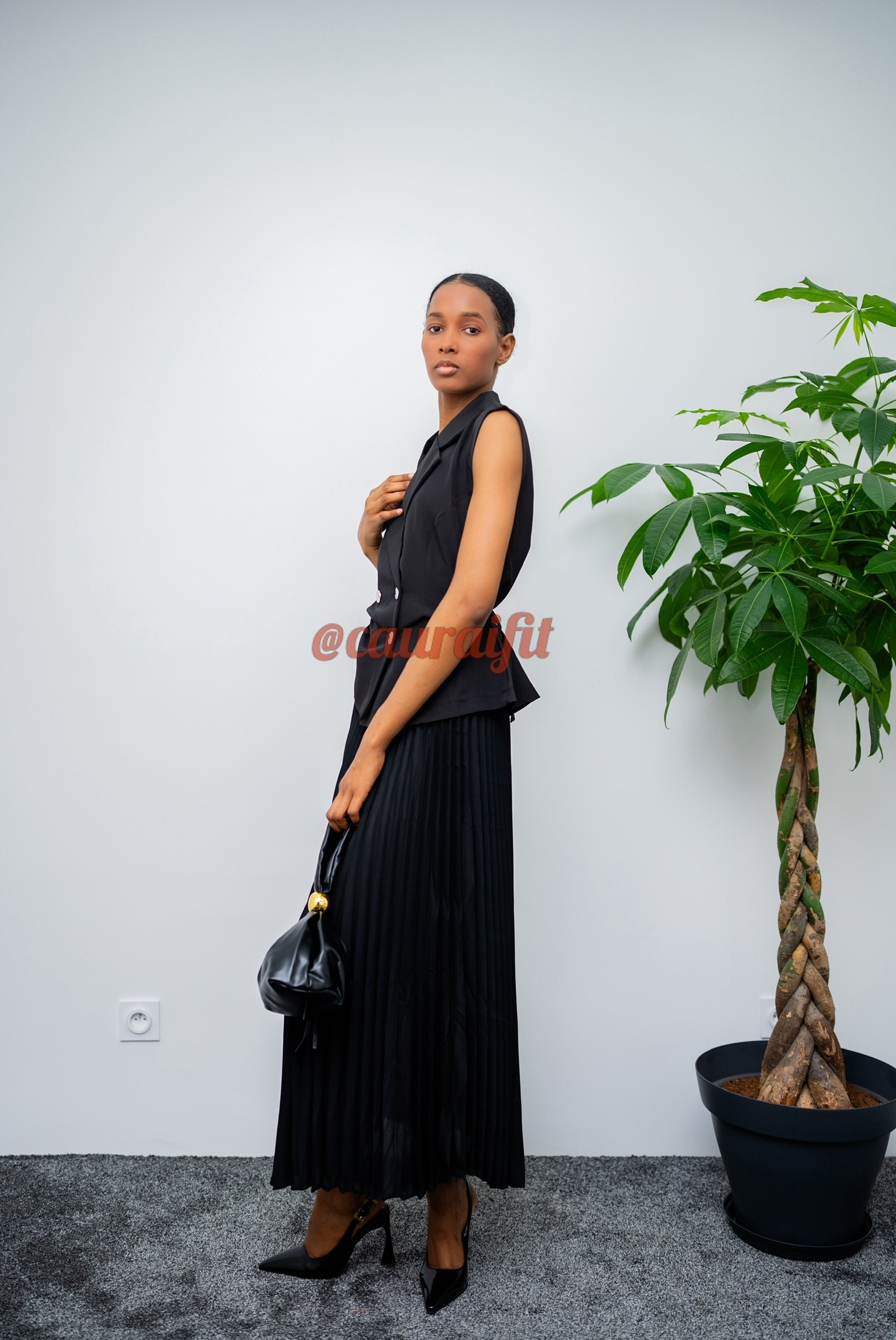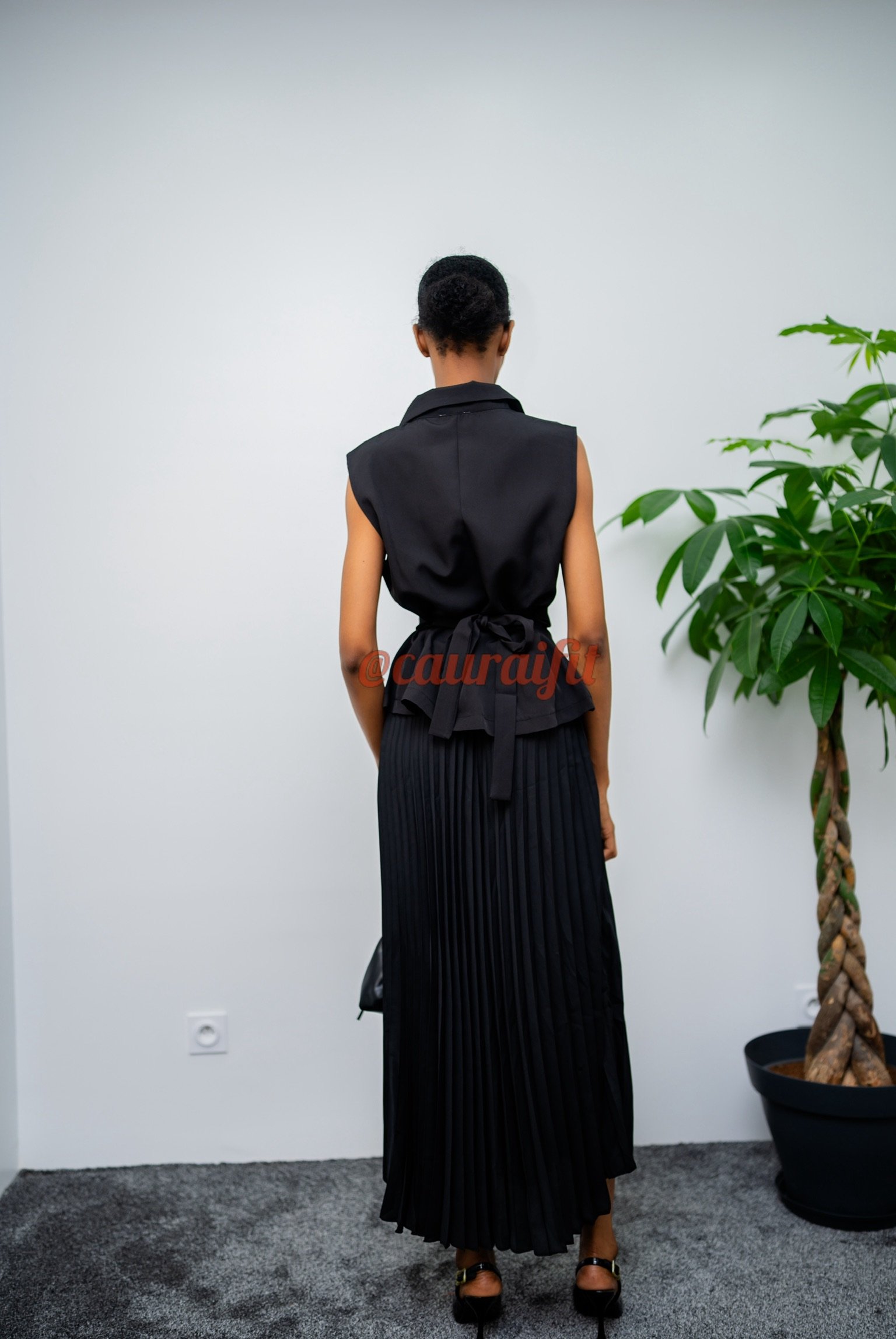 Robe deux-pièces noire en tissu fluide et structuré, pensée pour allier élégance formelle et modernité assumée. Le haut sans manches arbore un col blazer raffiné, une coupe croisée et une ceinture ajustée à la taille, créant une silhouette flatteuse et affirmée. Le double boutonnage ajoute une touche tailoring chic, tandis que la jupe longue plissée apporte mouvement et légèreté. Les talons « Coumba » et le sac « Sarrah » accompagnent la tenue pour un look sophistiquée, parfaite pour faire forte impression lors d’un événement ou d’une occasion spéciale.