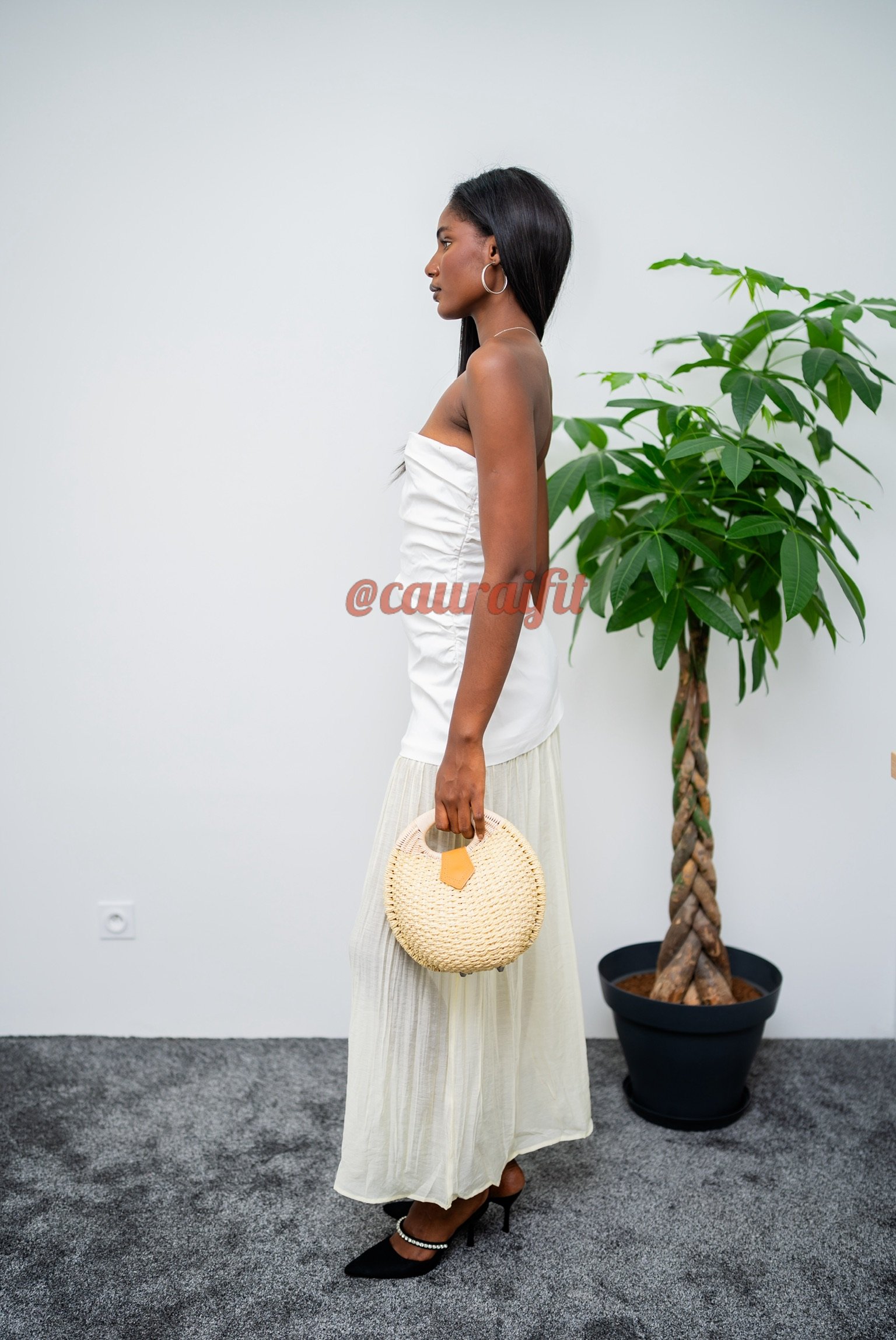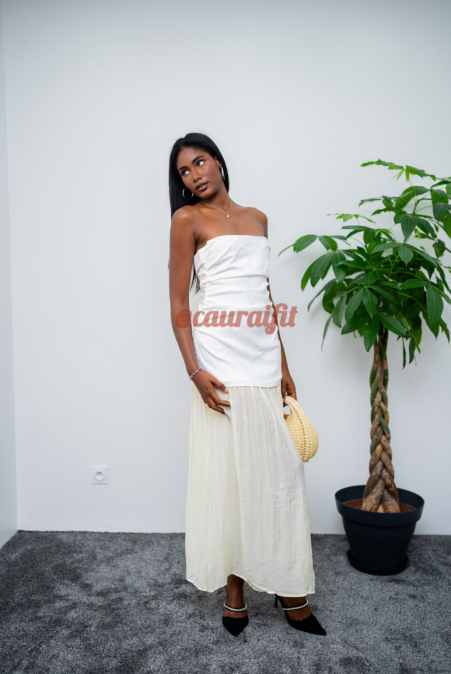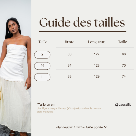 Robe bustier longue, composée d’un haut blanc structuré et délicatement froncé, qui dessine le buste avec raffinement. La jupe longue plissée fluide, dans un ton crème doux, apporte mouvement et légèreté à chaque pas. L’association des textures et des teintes crée une silhouette aérienne et sophistiquée, parfaite pour les grandes occasions, cérémonies ou moments d’exception.