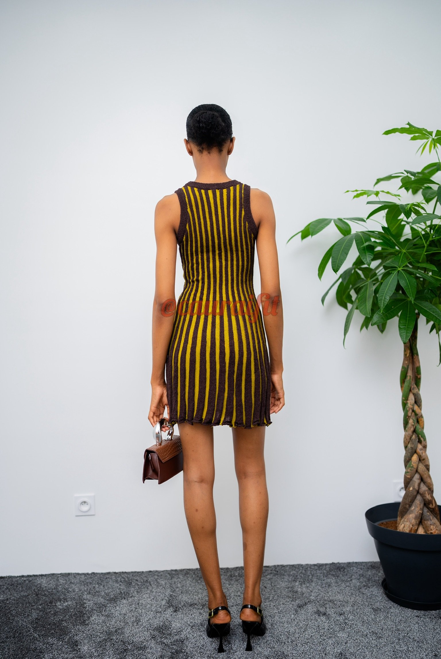 Robe courte sans manches en maille texturée rayée, mêlant des tons verts et marron pour un look à la fois naturel et original. Son col en V boutonné apporte une touche casual chic, tandis que la coupe évasée assure un tombé fluide et confortable. Facile à porter, c’est la pièce idéale du quotidien, à accessoiriser avec nos talons « Coumba » et le magnifique sac « Yacine » pour un style décontracté ou plus travaillé.