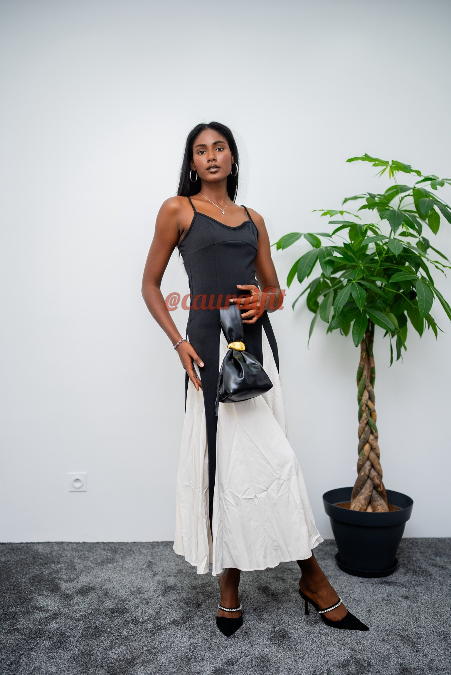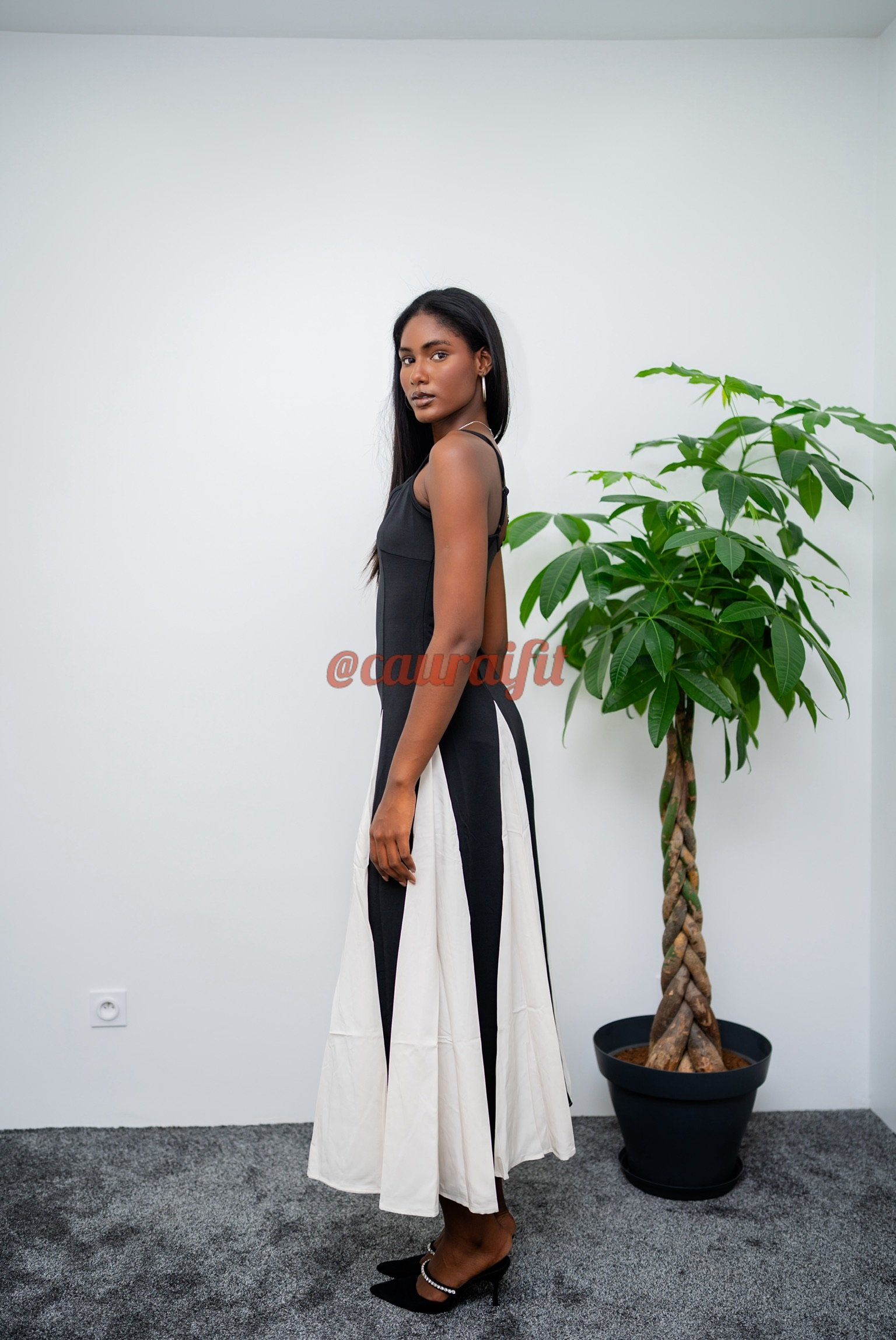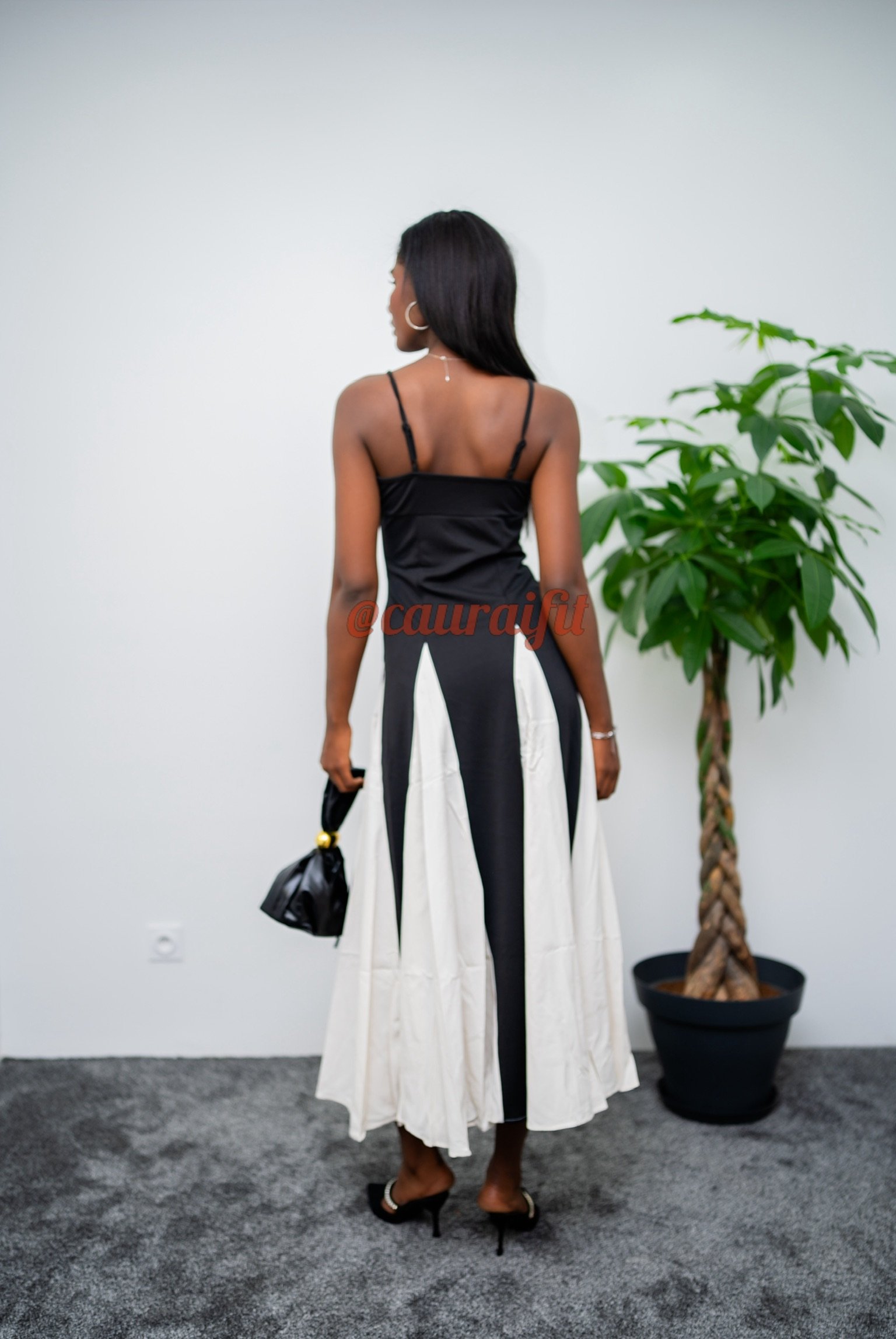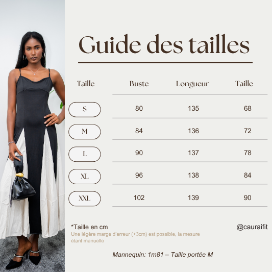 Robe longue bicolore, qui associe structure et fluidité pour une silhouette graphique et raffinée. Coupe bustier ajustée, de fines bretelles qui met en valeur le haut du corps avec élégance. Jupe évasée avec empiècement crème contrastant, apportant du mouvement et de la dimension. À accessoiriser avec nos mules à talons « Sophia » et notre sac « Sarrah » de couleur noire : pour une alliance parfaite entre modernité et grâce.