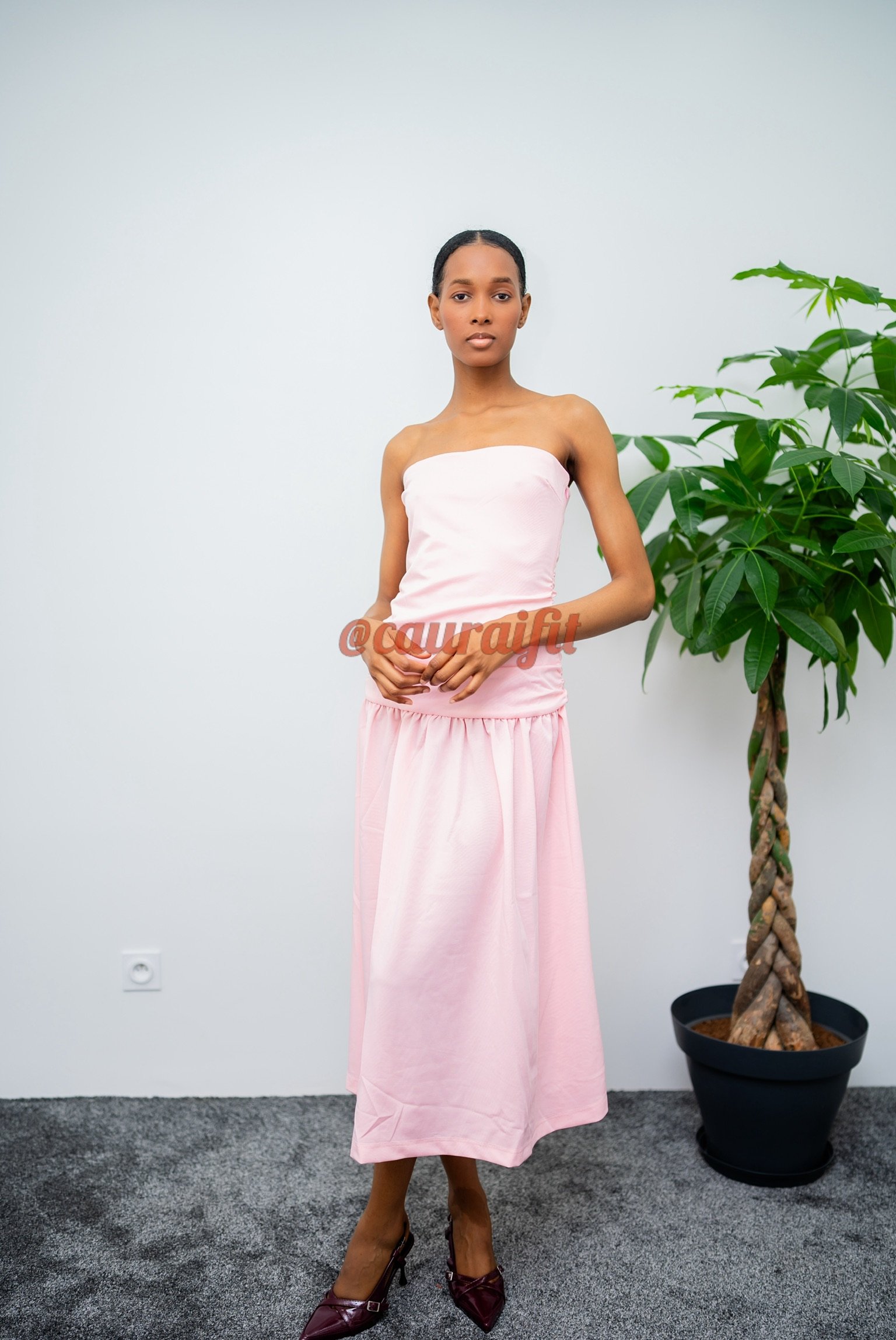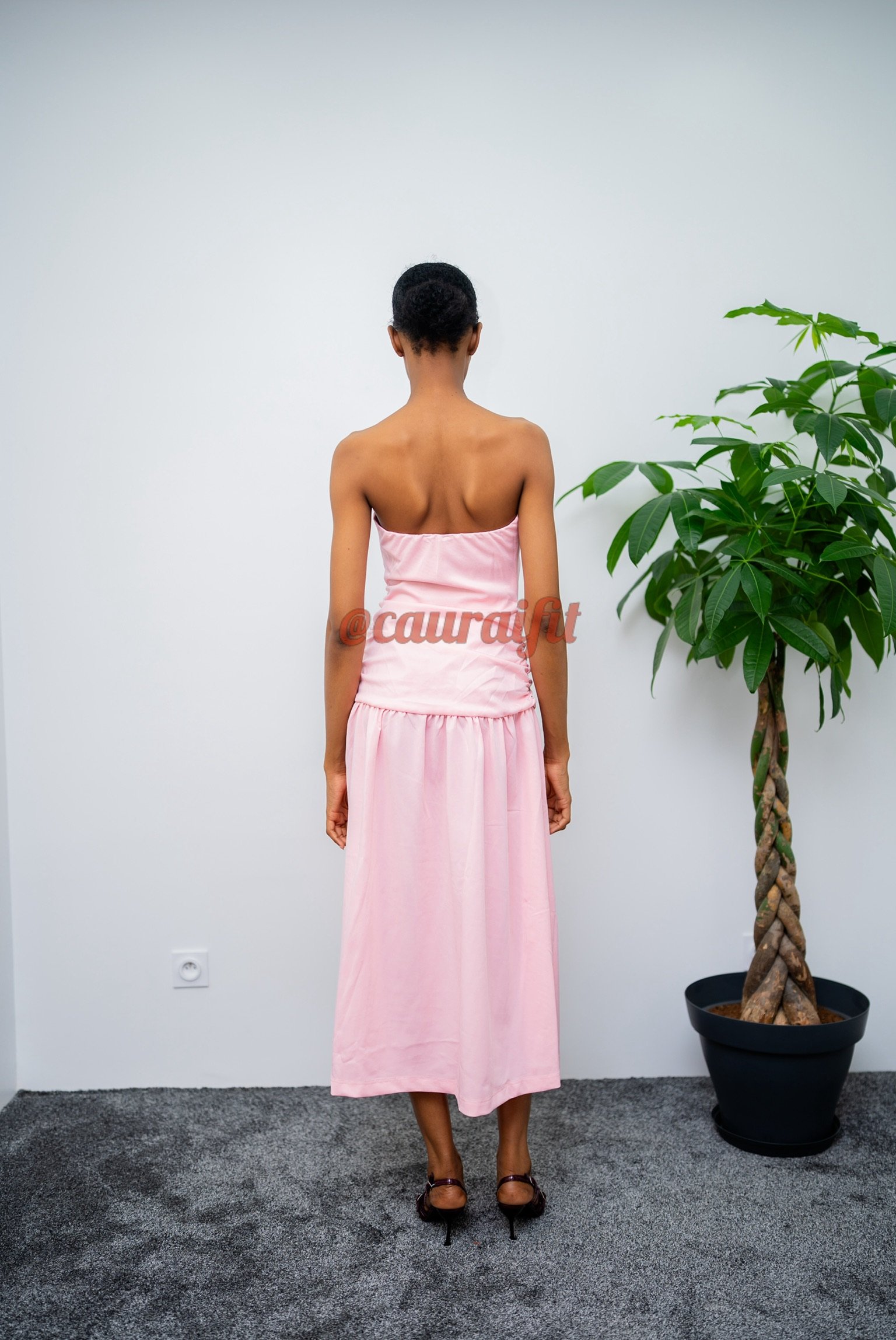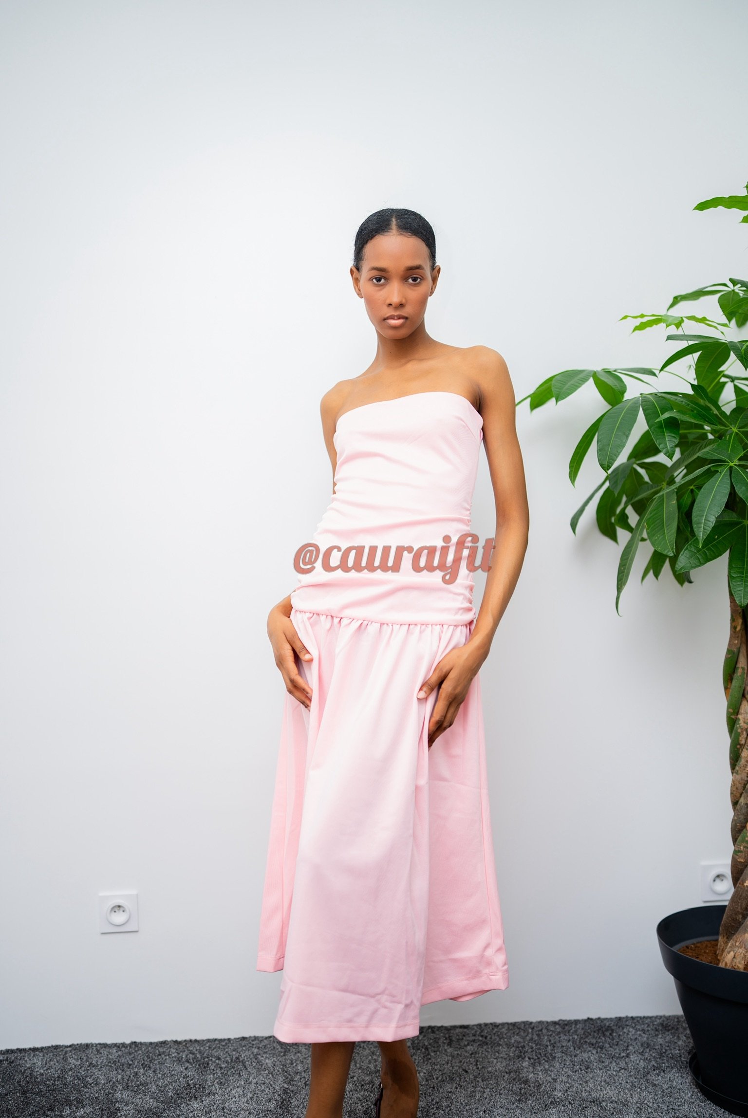 Robe longue en rose poudré délicat, confectionnée dans un tissu fluide et légèrement satiné qui capte la lumière avec une brillance subtile. Son bustier drapé est ajusté à la taille, soulignant la silhouette avec grâce, tandis que la jupe longue plissée apporte ampleur et légèreté à chaque mouvement. Une pièce aussi élégante que romantique.