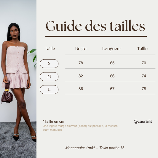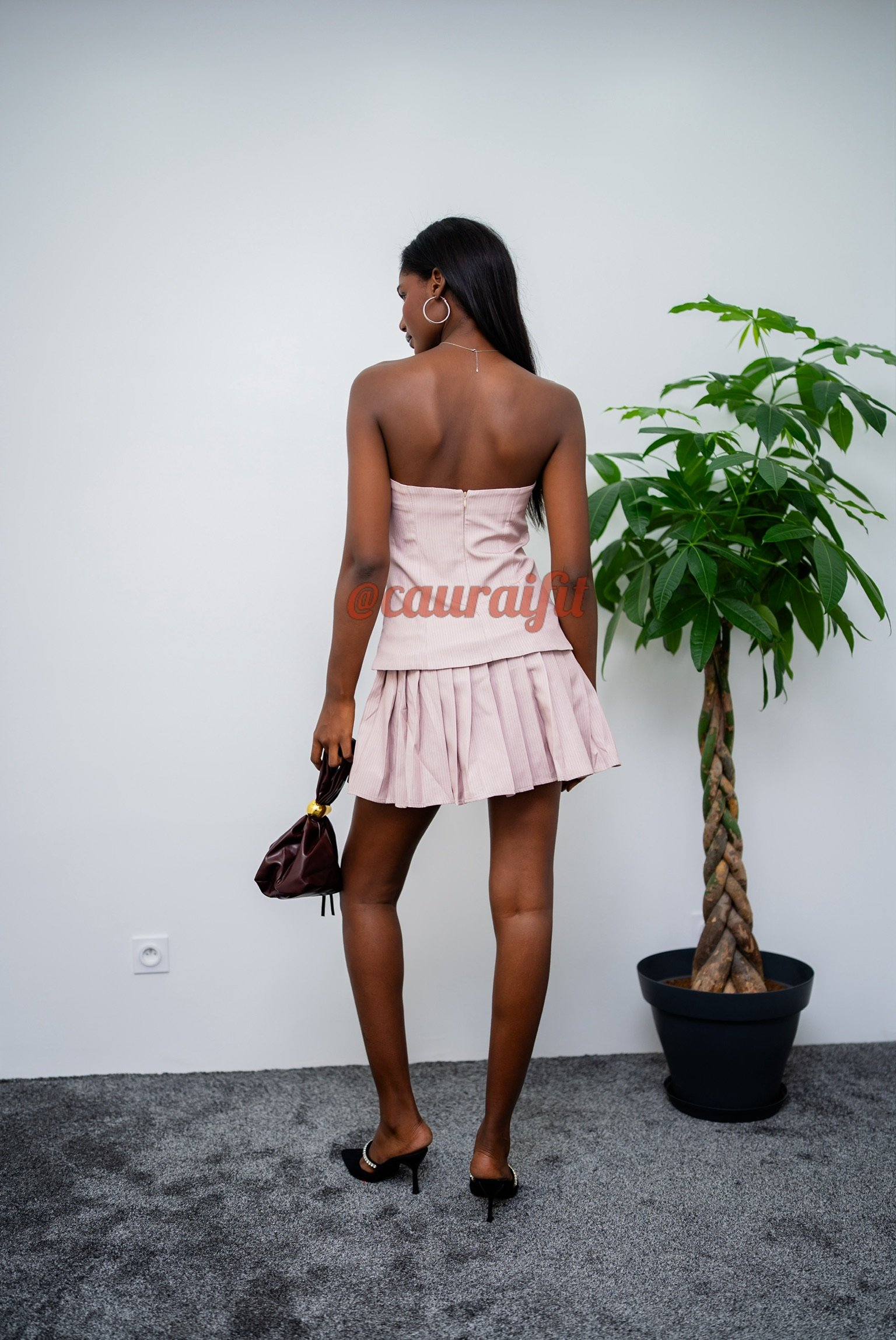 Robe bustier courte couleur taupe, au design inspiré du vestiaire tailleur. Le haut structuré façon blazer sans manches affiche une fausse poche poitrine et une rangée de boutons élégante sur le devant. En contraste, la jupe courte plissée et fluide apporte du mouvement et de la féminité à l’ensemble. Une pièce audacieuse et équilibrée, parfaite pour celles qui aiment jouer avec les codes classiques tout en restant ultra contemporaines.